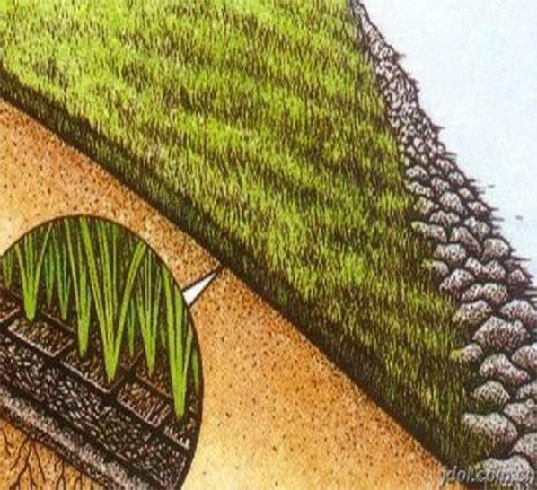 三維植被網(wǎng)是以熱塑性樹(shù)脂為原料,采用科學(xué)配方,經(jīng)擠出、拉伸等工序精制而成。它無(wú)腐蝕性,化學(xué)性穩(wěn)定,對(duì)大氣、土壤、微生物呈惰性。該產(chǎn)品底層為一個(gè)高模量基礎(chǔ)層,采用雙向拉伸技術(shù),其強(qiáng)度高,足以防止植被網(wǎng)變形,并能有效防止水土流失。表層為一個(gè)起泡層,膨松的網(wǎng)包以便填入土壤、種上草籽幫助固土,這種三維結(jié)構(gòu)能更好地與土壤相結(jié)合。在邊坡防護(hù)中使用三維植被能有效地保護(hù)坡面不受風(fēng)、雨、洪水的侵蝕。該產(chǎn)品功能是有利于植被生長(zhǎng)。隨著植被的形成,它的主要功能是幫助草根系統(tǒng)增強(qiáng)其抵抗自然水土流失能力。